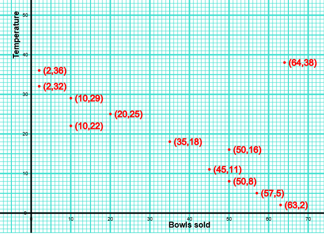 The scatter graph shows the maximum temperature (oC) and the number of bowls of soup sold at a sandwich shop on twelve randomly selected days last year.