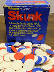Originally launched in 1953 (rebranded in 1968 and 1977) by W.H. Schaper as a boxed board game. This activity is adapted from an article by Dan Brutlag, BRUTLAG, D. (1994). Choice and Chance in Life: The Game of "Skunk". Mathematics Teaching in the Middle School, 1(1), 28-33. In this version of Skunk there is a choice of using one, two or three dice. Pupils could analyse the probability of a one appearing by creating a possibility space diagram. Additional Skunk resources are available here when you are signed in to your Transum subscription account. If you do not yet have an account and you are a teacher, tutor or parent you can apply for one by completing the form on the Sign Up page. A Transum subscription also gives you access to the 'Class Admin' student management system, downloadable worksheets, many more teaching resources and opens up ad-free access to the Transum website for you and your pupils. The dice used in this activity have been hypnotised (programmed) not to come up with a one on the first roll of each round. If you prefer not to play with this feature untick the first checkbox below.