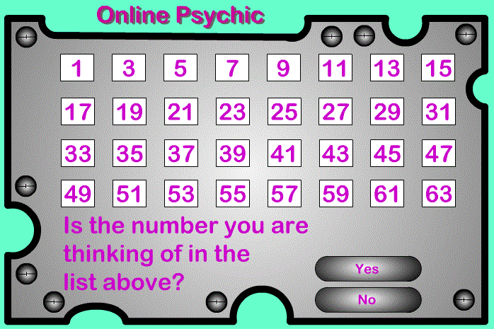 Follow the instructions and the online psychic will work out which number you are thinking of. How does it work? Play it a number of times, look for patterns, investigate until you too can be an Psychic.